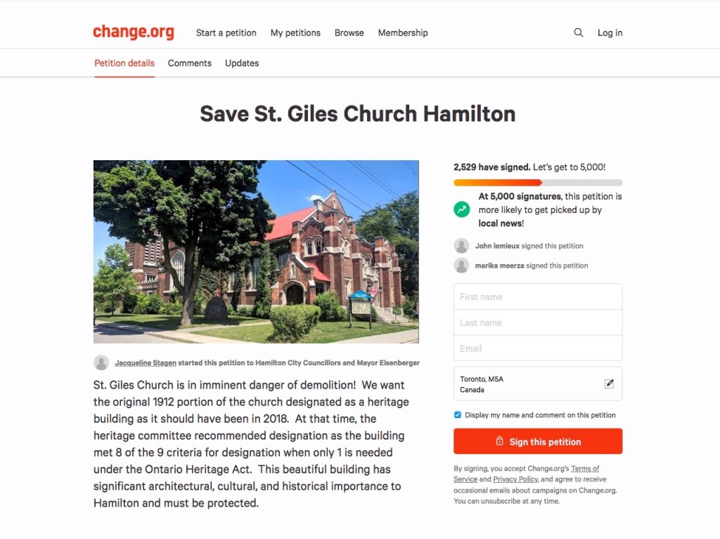 We continue to find it heartwarming and encouraging that thousands of people — from the neighbourhood, Hamilton, and beyond — support saving St. Giles. Our petition to save it has over 2,500 signatures on it and counting. Read just a few of the comments from supporters: you’ll see how meaningful this building is to so many.
